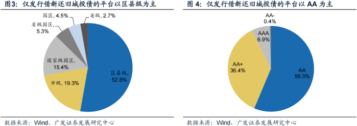 同时,我们统计了2023年1-8月仅发行借新还旧城投债的平台,数量达773家,占同期发行城投债平台数量的43.4%,涉及城投债金额约1.28万亿元,占同期城投债发行金额的30%。从行政级别来看,以区县级为主,数量占比超过一半;从主体评级来看,以AA评级主体为主,占比达56.3%。
