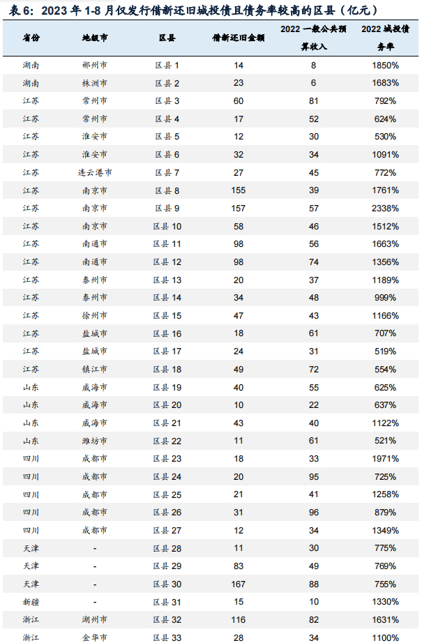 我们统计了2023年1-8月仅发行借新还旧城投债,并且募集资金超过10亿元的区县,合计78个。结合2022年城投债务率(发债城投有息债务/一般公共预算收入)来看,其中城投债务率高于500%的有49个,主要分布在江苏、浙江、重庆,其中多数区县2022年一般公共预算收入在50亿元以下。