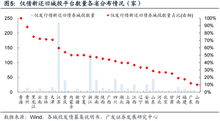 分省份来看,2023年1-8月仅发行借新还旧债券的平台主要分布在江苏和浙江,分别为236家和130家,其次是山东、四川、重庆、湖南,数量在40-50家。从仅发行借新还旧债券平台数量占比来看,青海为100%,贵州、黑龙江、云南、吉林、天津占比也较高,超过70%,而河南、福建、广东、山西占比较低,不足20%。