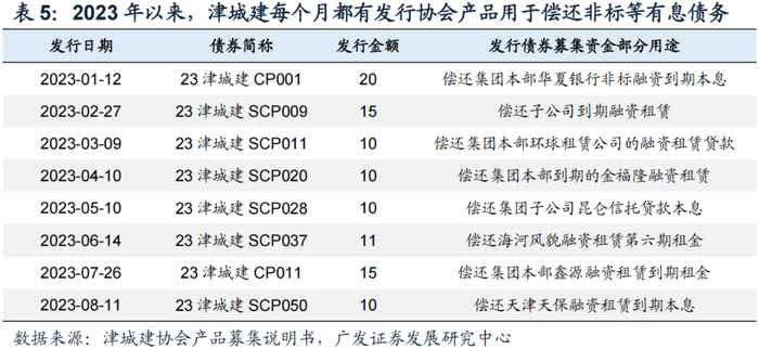 此外,我们观察到天津部分市级平台在2023年募集资金用途限制有所突破。以天津城市基础设施建设投资集团有限公司为例,其2022年发行的协会产品基本都用于借新还旧,而2023年以来每个月都有发行协会产品用于偿还非标等有息债务。此外,天津轨道交通集团有限公司、天津渤海国有资产经营管理有限公司等平台2023年以来也有发行协会产品用于偿还有息债务。