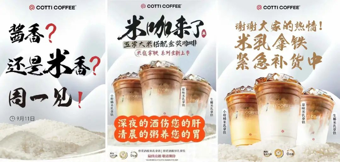 瑞幸“熟悉的对手”库迪咖啡,在“酱香拿铁”大爆后,立马表示“酱香?还是米香?周一见!”,随即上线“米咖”(用五常大米搭配金奖咖啡制作)。“米乳拿铁系列”产品包含原味米乳拿铁、小柑橘米乳拿铁、生椰米乳拿铁三款,并打出宣传语“深夜的酒伤您的肝,清晨的粥养您的胃”。