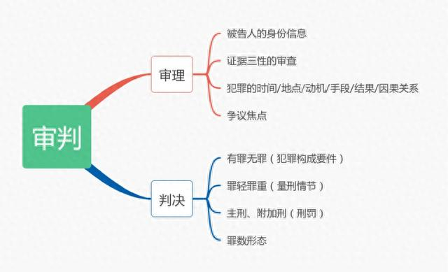 以“审判”为例,将其拆分为两个子主题“审理”和“判决”,审理的内容包括被告人的身份信息、证据三性的审查、犯罪的时间/地点/动机/手段/结果/因果关系、争议焦点等,判决的内容包括有罪无罪/此罪彼罪(犯罪构成要件)、罪轻罪重(量刑情节)、主刑、附加刑等,通过发散性思维将审判的所有因素罗列出来,从而形成一个整体,帮助我们直观地了解审判活动的进展。