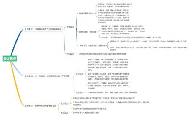 本案中的争议焦点2是巨蟒峰的损害结果是否达到了严重损毁的程度。支持观点事实和法律依据较为充分,应予采纳,从图中可以看出专家意见是从地质学的角度,认为打岩钉攀爬行为对巨蟒峰造成了永久性的损害,破坏了其基本属性即自然性、原始性、完整性,达到了严重损毁的程度。