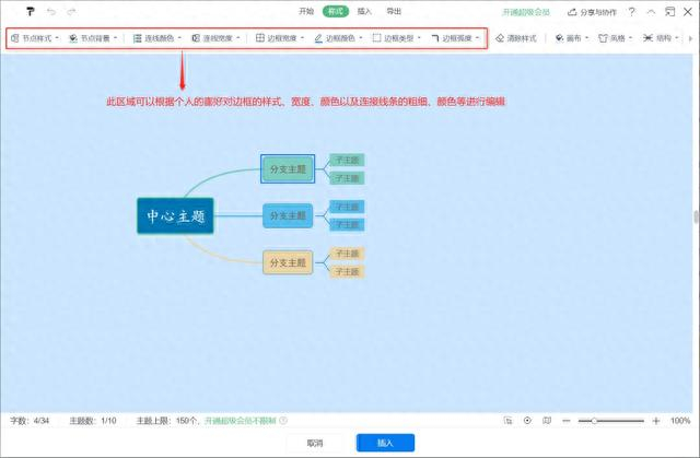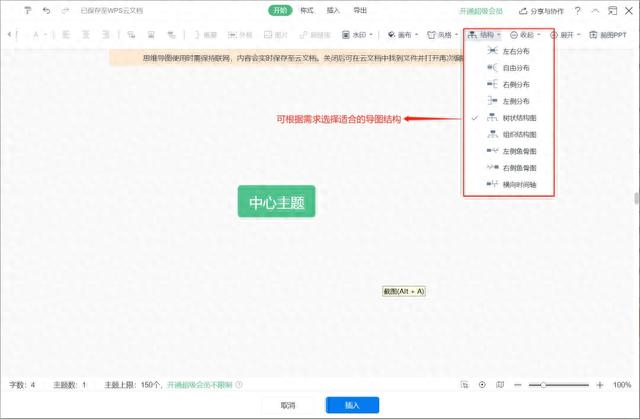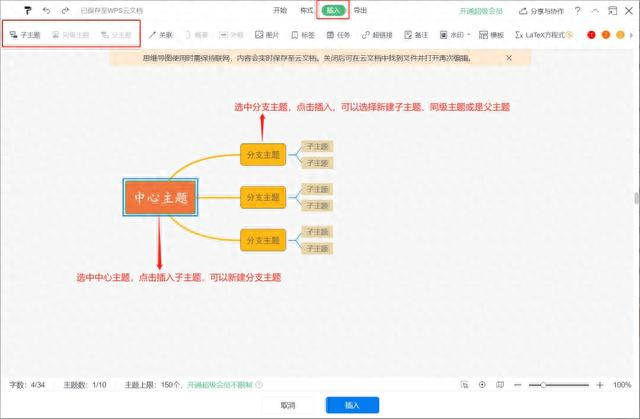 先新建一个“中心主题”并拖动到合适的位置,选中“中心主题”,点击插入,可新建“分支主题”。