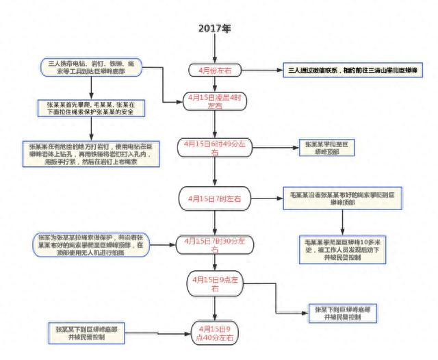 在张某某、毛某某攀爬开始时,张某为张某某拉绳索做保护,之后张某回宾馆拿无人机,再返回巨蟒峰,沿着张某某布好的绳索于早上7时30分左右攀爬至巨蟒峰顶部,在顶部使用无人机进行拍摄。