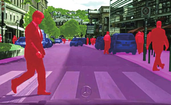 EfficientViT可使自动驾驶汽车高效地执行语义分割,这是一项高分辨率计算机视觉任务,涉及对场景中的每个像素进行分类,以便汽车能够准确识别物体。图为演示视频中的一张照片,显示了用于物体分类的不同颜色。