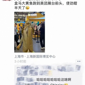 就在不久前7月底的ChinaJoy展会上,盒马护卫队的大黄鱼就跑到了美团展台,旁若无人般使劲瞪了美团老半天,立马成为了人群中的“显眼包”,然后美团的袋鼠在展会上逮到盒马就直接回瞪反弹,在社交媒体的造梗传播下就成了:虚假的商战——写字楼里运筹帷幄;真实的商战——我瞪死你!二者同时出圈。