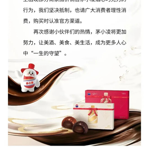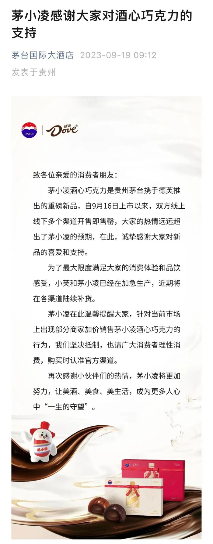 9月19日早间,针对近期茅小凌酒心巧克力在多个渠道开售即售罄的情况,茅台国际大酒店微信公众号发文表示,坚决抵制部分商家加价销售茅小凌酒心巧克力的行为,请广大消费者理性消费,购买时认准官方渠道。为了最大限度满足大家的消费体验和品饮感受,茅小凌酒心巧克力已经在加急生产,近期将在各渠道陆续补货。