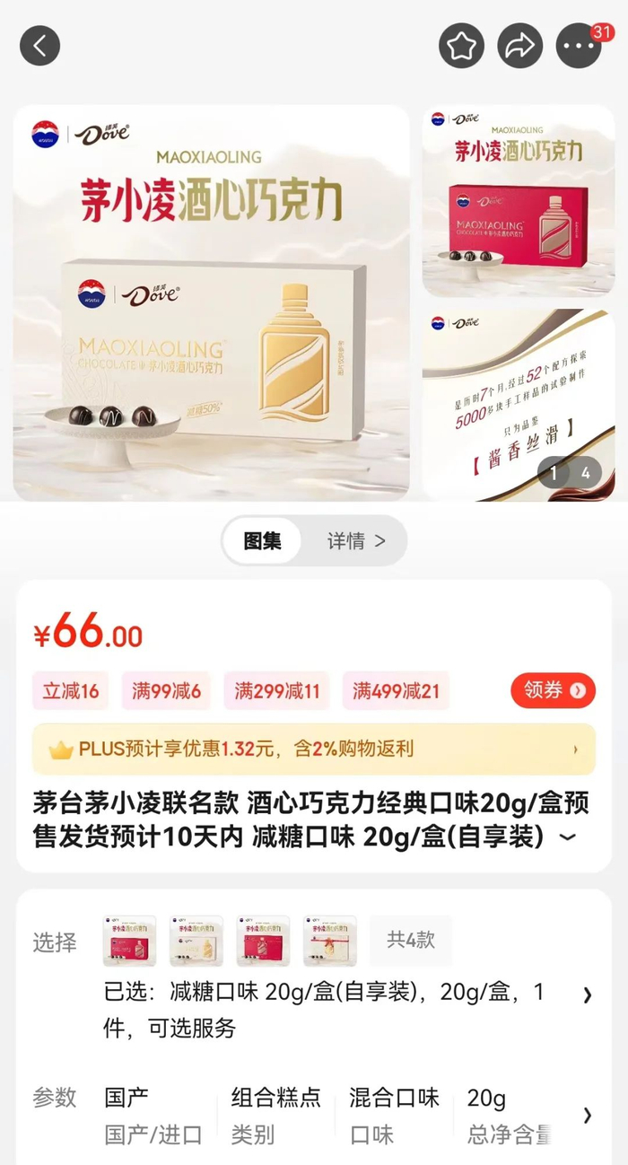 在德芙天猫旗舰店、天猫超市等渠道,茅小凌酒心巧克力则需要整点抢购。对于该款联名巧克力被抢空一事,德芙此前在官方微博上表示,正在加班加点地努力生产中。“德芙与茅台已达成长期合作,茅小凌酒心巧克力会一直陪伴在大家身边。”