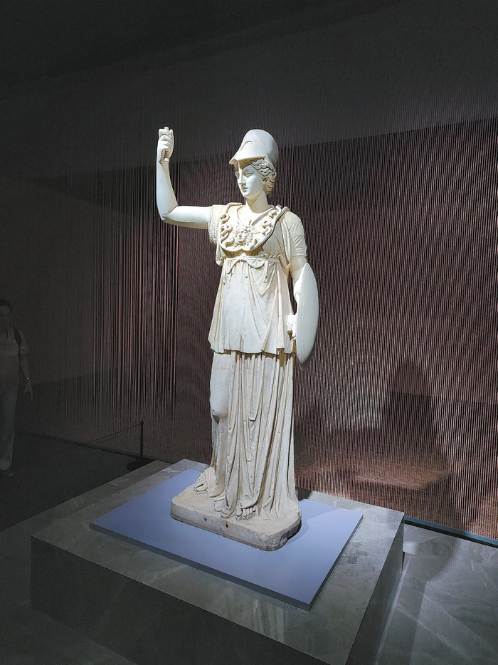 展厅里,身兼战争之神、智慧女神以及雅典城邦保护神的雅典娜(罗马名为密涅瓦)的雕像也是人见人爱。她一身戎装,长矛(已断裂)、头盔、饰有蛇发美杜莎的盔甲和盾牌等,一件也不少。