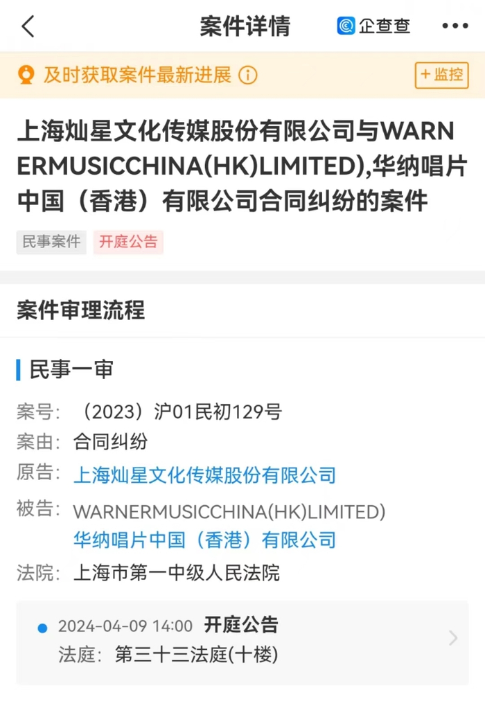 据天眼查App显示,近日,中国好声音节目制作方上海灿星文化传媒股份有限公司新增一则开庭公告信息,被告为华纳唱片中国(香港)有限公司(WARNER MUSIC CHINA(HK)LIMITED),案由为其他合同纠纷,案件将于2024年4月9日在上海市第一中级人民法院开庭审理。目前,该案具体案由尚不清楚。