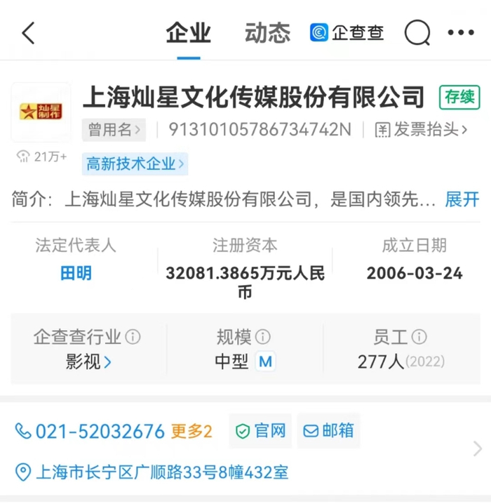 企查查app显示,上海灿星文化传媒股份有限公司,是国内领先的电视和互联网节目制作和运营商,注册地址在上海市长宁区,注册资本金3.6亿元人民币。