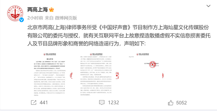 9月1日,北京市两高(上海)律师事务所(以下简称“两高上海”)受《中国好声音》节目制作方上海灿星文化传媒股份有限公司的委托与授权,就有关互联网平台上故意捏造散播虚假不实信息损害委托人及节目品牌形象和商誉的网络造谣行为发表声明,否认学员转身费50万元、学员3000万买冠军等传言。