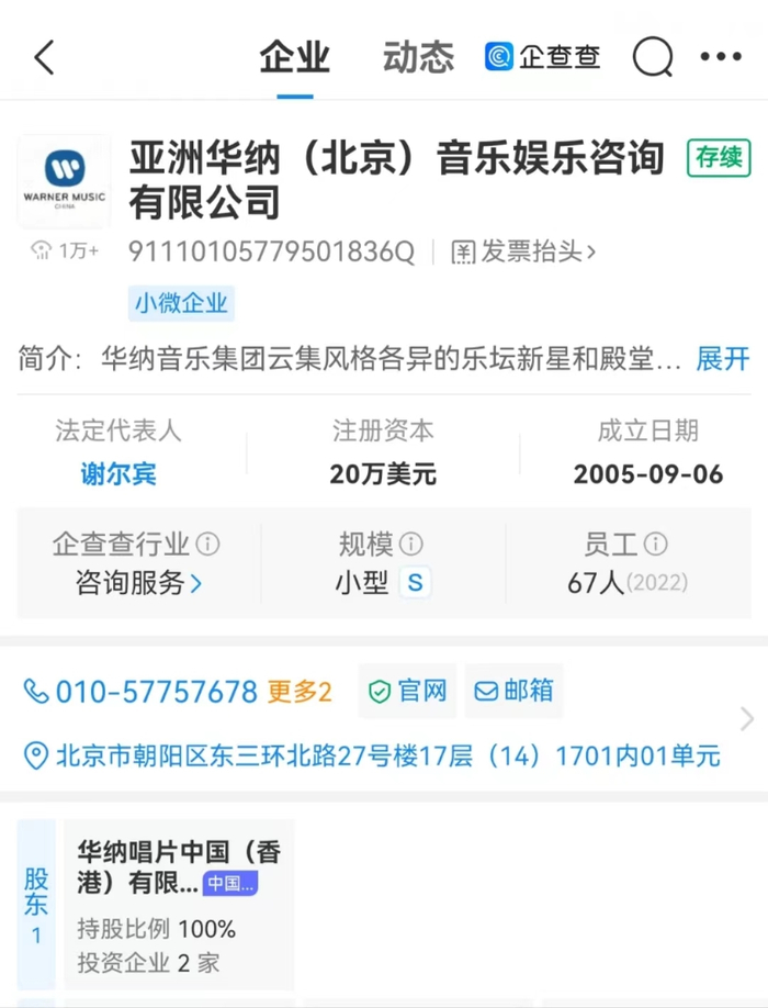 企查查显示,亚洲华纳(北京)音乐娱乐咨询有限公司由华纳唱片中国(香港)有限公司全资持股。