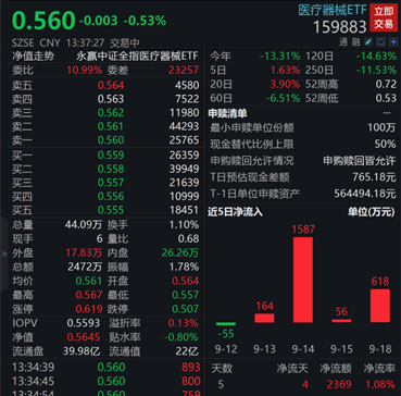 截至2023年9月18日,标的指数最新PE估值29.8730.58倍,低于指数发布以来近80%的时间区间,投资性价比凸显。未来,在“疫后复苏”、创新迭代、国产替代进程加速、创新出海国际化升级的逻辑共振中,国内医疗器械市场将开启万亿规模之路,各细分赛道全面开花,从跟跑到领跑,国产器械黄金时代或正在到来。场内可通过159883高效交易,场外也有联接013416可布局。