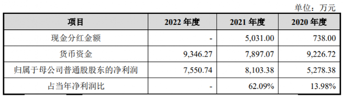 公司在2020年净利润为5278万元,账上货币资金为9226万元,客观来讲分红700多万不管从绝对额还是占比来说都还算合理范畴。然而,到了2021年,也就是申报IPO前一年,此时甚至已经在备案辅导阶段,现金分红却突然大幅度提升到了5031万元,而占同期净利润比例达到六成以上。