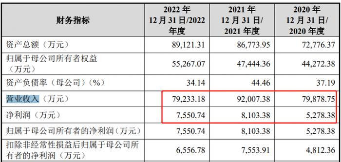 从招股书披露的情况看,公司2022年就开始存在业绩下滑的情况。报告期内,公司主营业务收入分别为7.97亿元、9.17亿元和7.9亿元,净利润分别为5278.38万元、8103.38万元及 7550.74万元。不难发现,2022年其营收和净利润都明显下滑。