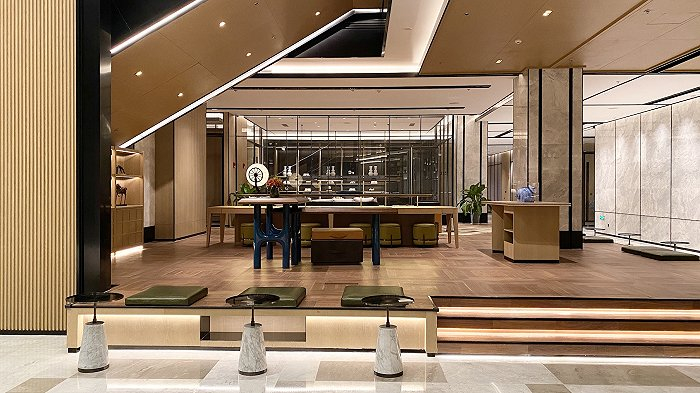 西安浐灞喜来登酒店的大堂被赋予“开放式共享空间”的定位,融合了多种喜来登品牌焕新元素,如共享长桌、工作室、电话亭,提供聚会、办公、用餐的灵活空间,不论是独自搬砖还是多人会议都能找到适合的一隅。