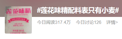 9月18日,#莲花味精配料表只有小麦##鸡精配料表第一位就是味精#等话题引发网友议论。而在此前,曾有谣言称“味精吃多了会脱发、致癌”,莲花味精产品一度受到影响。