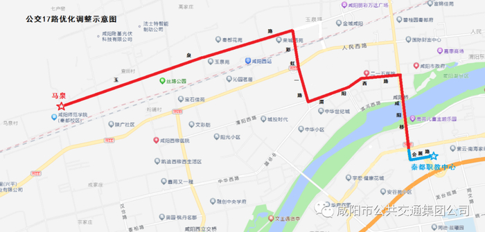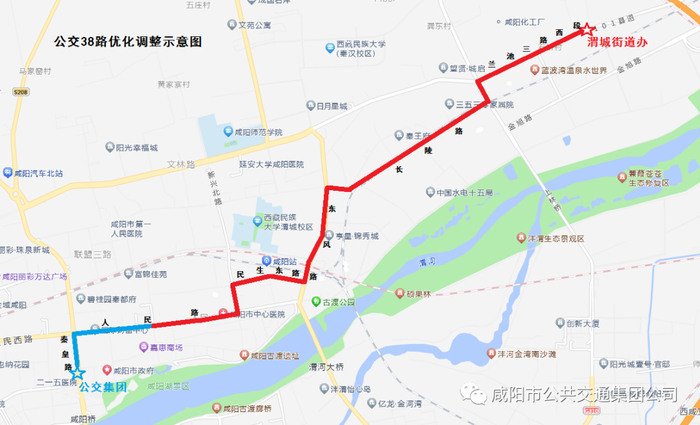 终点站由沣河森林公园地铁站调整至秦都职教中心,途经路段由秦皇路调整至彩虹一路。进一步降低线路重复系数;有效地将玉泉路、彩虹一路、渭阳西路串联,满足玉泉路沿线市民就学、就医出行需求(彩虹学校、陕中附院、彩虹医院、二一五医院、陕中二附院等);可继续满足沿线市民换乘地铁出行需求。