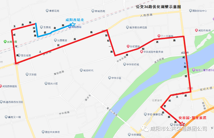 终点站由彩虹中学(高中校区)调整至咸阳西站北。“陈杨寨地铁站”接驳地铁1号线三期陈杨寨地铁站;“宝泉路地铁站”接驳地铁1号线三期宝泉路地铁站线路延伸后有效地将高铁和地铁串联,进一步方便沿线市民出行;回避严重拥堵路段,提高线路整体运行效率。