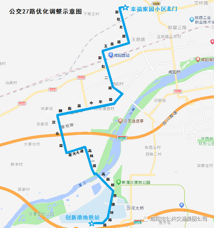 途经站点:幸福家园小区北门——彩虹北路·文兴路——古渡家园小区西门——彩虹北路·珠泉路——秦源小区东门——邮政局——华泰世纪华苑——玉泉西路·经电北路——咸阳西站北广场——宝泉路地铁站——西阳村什字——高科花园——中华西路地铁站——枫景苑小区——两寺渡东村——两寺渡西村——胭脂河坊——鑫苑·又一程——柏李村——汉仓路什字——汉仓路·香柏路——创业大厦——高科二路——彩虹光电——高新大桥北——思源环北路口——创新港医院——创新港东地铁站——思源环南路·东银杏路口——思源环南路·白露桥路口——思源环南路·西迁大道口——创新港地铁站