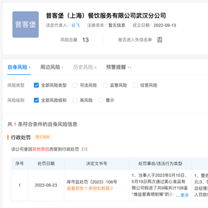 据天眼查App显示,近日,Shake Shack关联公司昔客堡(上海)餐饮服务有限公司武汉分公司因违法从事食品生产、经营,被武汉市江岸区市场监督管理局罚款10万元、没收违法所得6012元,同时,当事人总经理兼食品安全总监刘某某被罚款5.7万余元。