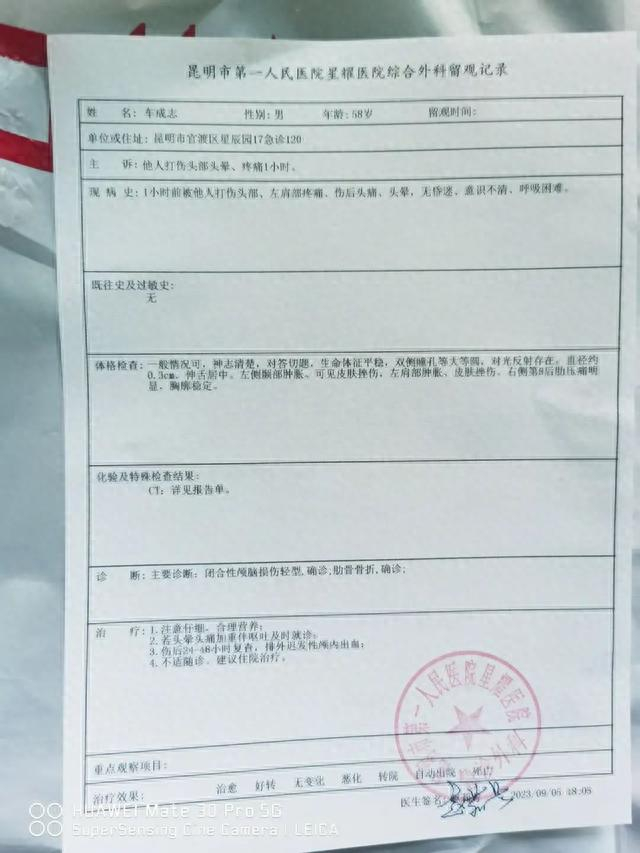 9月5日11时50分,车成志被120送往昆明市第一人民医院星耀医院抢救,“经医生诊断左侧颈部肿胀,皮肤挫伤,左肩部肿胀、皮肤挫伤,头部闭合性脑损伤,脸部肿胀挫伤,肋骨骨折。”车先生表示:父亲住院到目前,已经交了9000多元,“整个救治过程城管一分钱也没垫付,只是当天警察通知城管来医院,(城管)看过一次就走了。”车先生说。