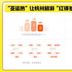 飞猪数据还显示,亚运会期间赴杭观赛和旅游的主力军来自浙江省外的上海、深圳、成都、广州、南京等地,省内的宁波、温州、台州、绍兴、嘉兴等地,以及泰国、新加坡、韩国、日本、马来西亚等。在亚运会的带动下,今年国庆假期浙江旅游的预订量也同比去年劲增超2倍,增速领跑江浙沪目的地。