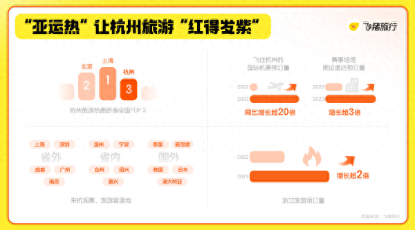 澎湃新闻(www.thepaper.cn)9月19日从飞猪旅行获悉,截至9月13日,上海、北京、杭州、成都、广州、深圳、香港、重庆、乌鲁木齐、西安成为中秋国庆假期国内游热门目的地前十名,杭州跻身国内游热门目的地前三名。此外,亚运会期间飞往杭州的国际机票预订量同比去年增长超20倍,杭州赛事场馆周边的酒店预订量同比去年增长超3倍。
