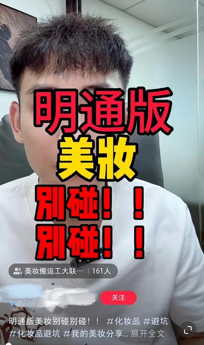 近日,一个自称曾经做过深圳明通档口老板的博主在社交平台告诫粉丝:只要是带有“明通版”三个字的都是假冒伪劣美妆。