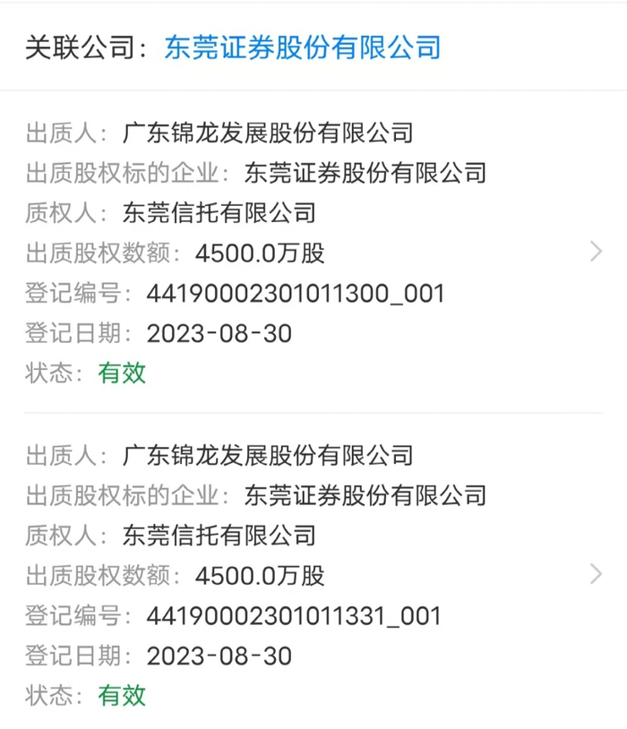天眼查显示,东莞证券在8月30日发生过4笔股权质押,每笔4500万股,合计1.8亿股,出质人均是锦龙股份,质权人则为东莞信托,登记时间均是2023年8月30日。而另外的1.2亿股质押暂无法在公开渠道查询到。