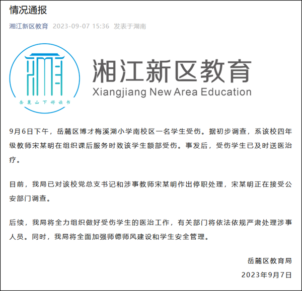 同日,湖南湘江新区教育局微信公号“湘江新区教育”发布有关网传老师打伤学生头骨的情况通报,称已对该校党总支书记和涉事教师宋某明作出停职处理,宋某明正在接受公安部门调查。