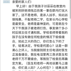 该家长发布的信息提到,殴打学生男教师为宋某某。