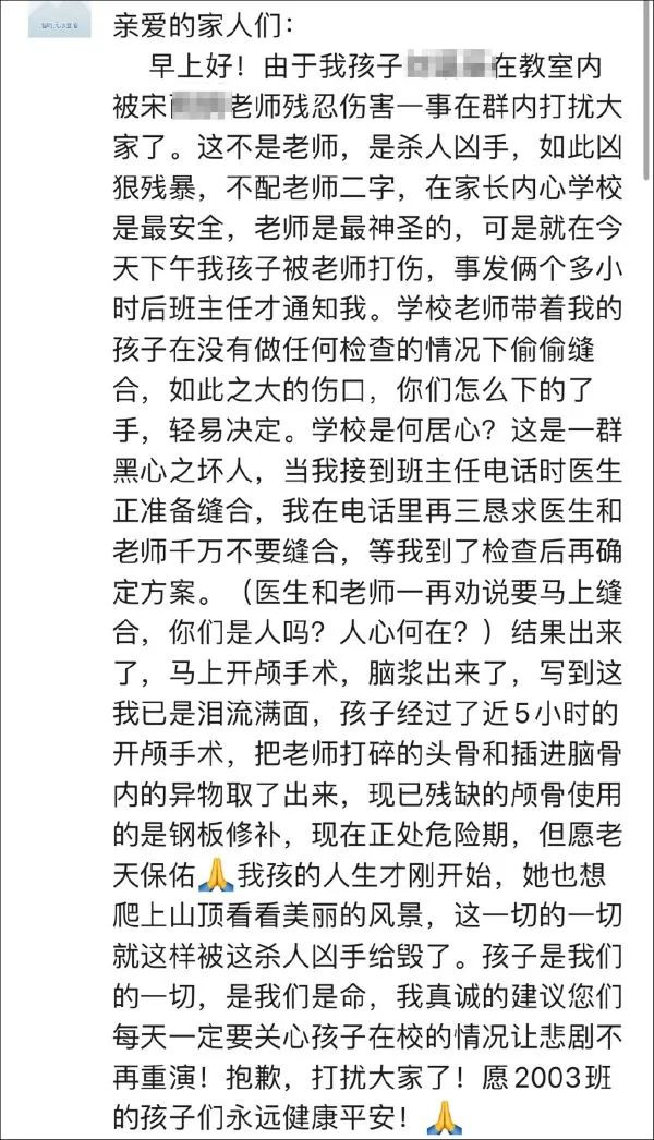 该家长表示,男老师拿三角尺打孩子的脑袋。自己接到班主任电话时医生正准备缝合。家长指出,“学校老师带着我的孩子在没有做任何检查的情况下偷偷缝合”。后来进行了开颅手术,经过5个小时手术,才将被打碎的头骨和异物取出。