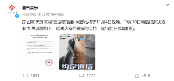 此前,潮石音乐曾在9月12日发布“薛之谦‘天外来物’巡回演唱会-成都站9月10日场后续解决方案”,今日又在该解决方案的基础上做出三点调整。