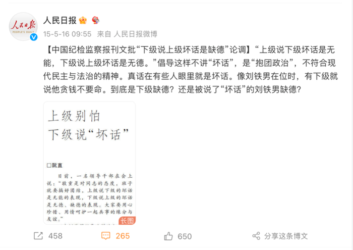 另外,《中国纪检监察报》也刊文痛批“下级说上级坏话是缺德”论调。