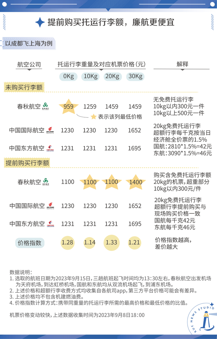 尽管单论票价,廉航的优势一目了然,但动辄上百的托运费用还是会让人担心:选择廉航,真的更便宜吗?RUC新闻坊以9月15日成都-上海的航线为例,发现在需要托运行李的前提下,提前购买“含免费托运行李额”的廉航机票确实更便宜。