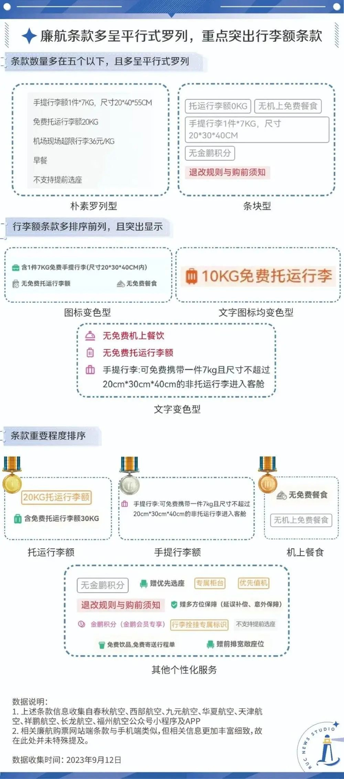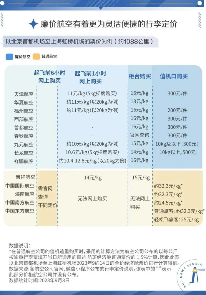 为了做好下一个长假的出行攻略,RUC新闻坊收集了10家廉价航空公司和4家普通航空公司的官网信息,比较分析廉价航空在票面价格、行李费用、退改规则和视觉方面的具体情况,希望能为仍在观望的朋友们提供一些帮助。