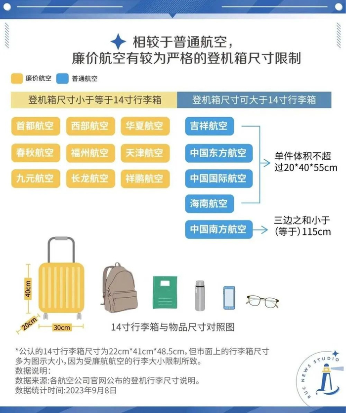 好消息是,廉航们依然有随身携带的免费行李额,坏消息是,它们让你随身携带的东西真不多。在市面上十家廉价航空中,仅吉祥航空规定的登机箱尺寸大于14寸,与许多大型航司相同,其余九家廉价航空均要求乘客随身登机箱小于十四寸行李箱。