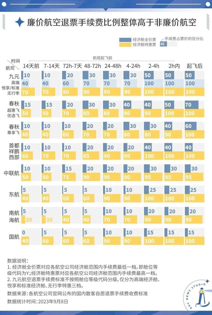 廉价航空的退票手续费比例整体高于非廉价航空,且距离航班起飞时间越近,退票的手续费就越高,到航班起飞前两天甚至达到票价的90%。以九元航空为例,假设你购买了一张价值300元的廉航票,但在起飞前两天决定退票,扣除手续费后你只能得到30元的退款。如果你购买的是非廉航的特惠票(以海南航空为例),退票后还剩180元,是廉价航空的6倍。