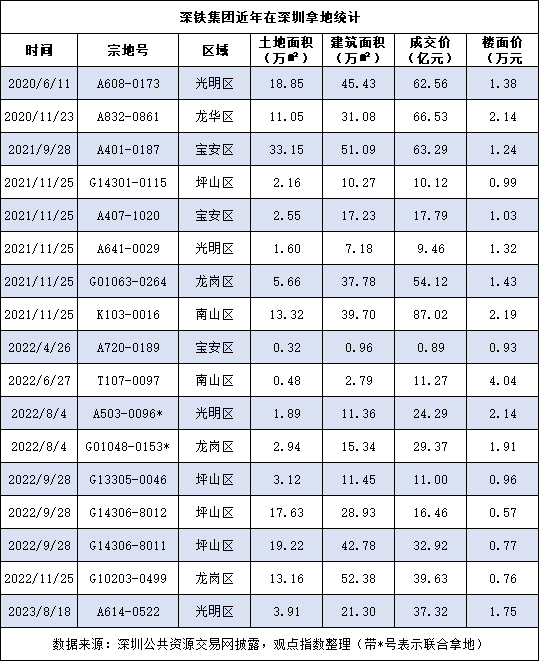 据观点新媒体不完全统计,仅2020年6月至今,该公司在深圳已获取土地17宗,拿地总价574.04亿元,较总起始价仅溢价1.23%,对应建筑面积427.04万平方米。