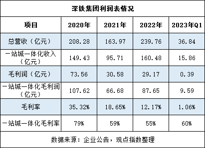 其中2020-2022年,深铁实际销售额分别为171.07亿元、268.04亿元、270亿元,2023年一季度则为105.75亿元。