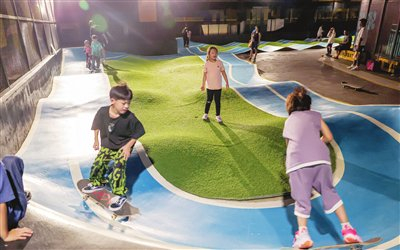 天津梅江环宇城是梅江地区第一个大型TOD(以公共交通为导向的开发模式)项目。作为购物中心的特色之一,占地2800平方米的屋顶滑板公园成了热门“打卡地”。事实上,屋顶上不仅有滑板场地,还还原了一个真实的街道场景,人行道、红绿灯等元素集合在一起,给人带来身处街头的氛围感。尤其在傍晚,三五成群的“板友”、骑小轮车的孩子、专程来拍照的顾客,让这个“空中运动场”人气十足。