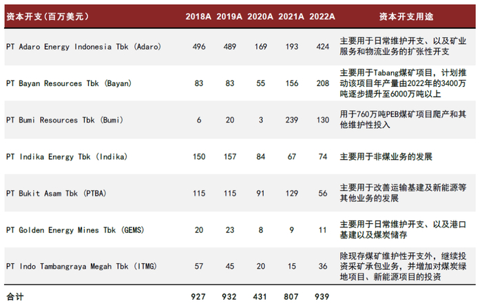图表19:印尼主要煤企资本开支情况反映当前煤炭项目扩张性投资可能相对有限