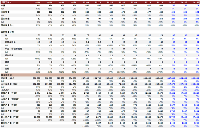 预计2023-25年印尼煤炭出口增速为10%、0%、2%。考虑到主要煤企生产规划和潜力,我们认为印尼煤炭供给仍有增长空间,预计2023年印尼产量有望同比增长9%至7.45亿吨,不过2024-25年印尼产量增幅可能收窄至2%左右。考虑到电力、矿业冶炼等需求的提升,我们预计印尼国内煤炭需求将稳步增长,预计2023-25年印尼国内销量同比增速为6%、5%、4%。在满足当地需求的情况下,我们预计2023-25年印尼煤炭出口量为5.15、5.15、5.24亿吨,同比分别增长10%、0%、2%。
