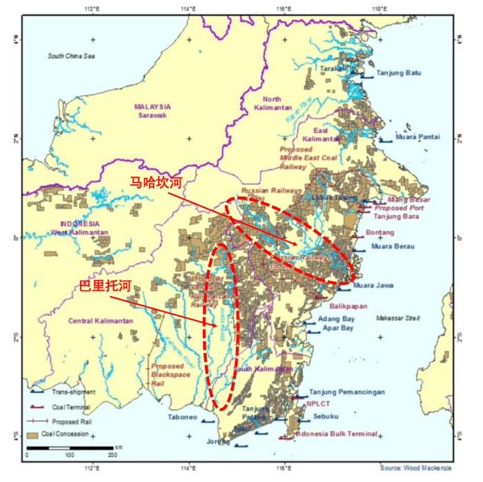 ► 加里曼丹岛的煤炭主要依赖马哈坎河(Mahakam River)、巴里托河(Barito River)等河流的干支流,通过驳船运至内河中转码头,再转载大型驳船出海,最终抵达消费地,也可运至港口和海上过驳平台,再转载大型货轮最终抵达消费地。由于目前加里曼丹岛上没有铁路线用于煤炭运输,部分距离水运通道偏远的煤炭资源仍难获得有效开发利用。