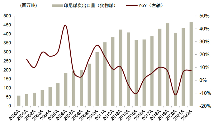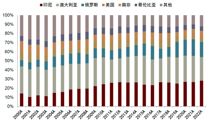 新世纪以来,印尼煤炭产量及占比逐年提升。2000年以来,除了受2013-2016年煤价下行周期和2020年新冠疫情影响以外,Energy Institute数据显示印尼煤炭产量整体表现稳步提升的态势,由2000年的7,700万吨提升至2022年的6.87亿吨,22年CAGR达到10.5%(vs. 同期全球煤炭产量CAGR 2.9%)。该国煤炭产量占全球总产量的比重也由2000年的1.6%上升至2022年的7.8%。