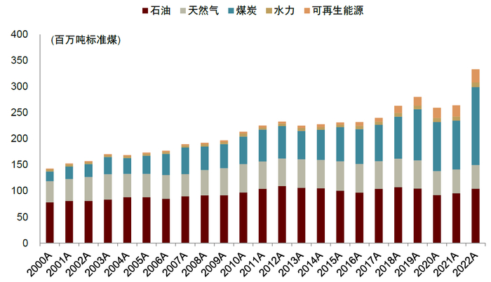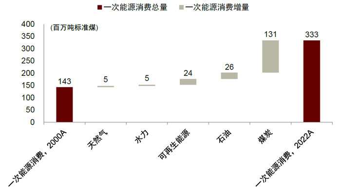 印尼能源需求的大部分增量由煤炭满足。Energy Institute数据显示,2000-2022年印尼一次能源消费总量由1.43亿吨标准煤增长至3.33亿吨标准煤,其中天然气、水力、可再生能源和原油的消费增长相对有限,而煤炭消费增量最大,由1,877万吨标准煤增加至1.49亿吨标准煤,贡献了过去22年印尼60%以上的一次能源消费增长,这反映出过去20年印尼日益增长的能源需求离不开对煤炭的依赖。