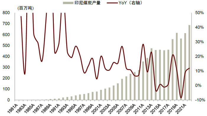 1967年,印尼矿业基本法(1967年第11号法律)[3]和外国投资法颁布,针对矿业基本法的实施条例也于1969年发布,在此背景下印尼煤炭行业发展的土壤开始形成。上世纪70年代,石油价格的大幅上涨一定程度推升全球煤炭需求,随后外资才开始逐渐增加对印尼的煤炭投资。不过由于勘探和项目建设需要时间,直至上世纪80年代,随着煤矿陆续正式投产,印尼煤炭产量才开始进入快速增长期。